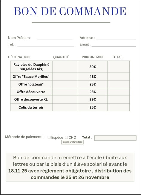 Attention date courte pour commander , tous les bons doivent être accompagnés du règlement (chq a l’ordre de APE Puygiron ou espèce) , le tout a donner a l’école avant le 18 Novembre